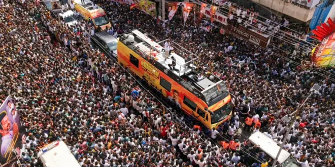 കരൂര്: തമിഴക വെട്രി കഴകം (ടിവികെ) അധ്യക്ഷനും നടനുമായ വിജയ് കരൂരില് നയിച്ച റാലിക്കിടെയുണ്ടായ തിക്കിലും തിരക്കിലും 39 മരണം. മരിച്ചവരില് 2 വയസ്സുകാരന് ഉള്പ്പെടെ 8 കുട്ടികളുണ്ട്. രണ്ട് ഗര്ഭിണികള് ഉള്പ്പെടെ 17 സ്ത്രീകള്ക്കും ജീവന് നഷ്ടമായി. സംസ്ഥാന വ്യാപകമായി വിജയ് നടത്തുന്ന പ്രചരണ പരിപാടിയുടെ ഭാഗമായാണ് ശനിയാഴ്ച കരൂരില് റാലി സംഘടിപ്പിച്ചത്. 10000 പേര് പങ്കെടുക്കുന്ന റാലിക്കാണ് ടിവികെ അനുമതി തേടിയത്. എന്നാല് ഒന്നര ലക്ഷത്തിലധികം പേര് റാലിയില് പങ്കെുടുത്തെന്നാണ് കണക്ക്.