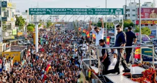 കരൂര്: തമിഴക വെട്രി കഴകം (ടിവികെ) അധ്യക്ഷനും നടനുമായ വിജയ് കരൂരില് നയിച്ച റാലിക്കിടെയുണ്ടായ തിക്കിലും തിരക്കിലും 39 മരണം. മരിച്ചവരില് 2 വയസ്സുകാരന് ഉള്പ്പെടെ 8 കുട്ടികളുണ്ട്. രണ്ട് ഗര്ഭിണികള് ഉള്പ്പെടെ 17 സ്ത്രീകള്ക്കും ജീവന് നഷ്ടമായി. സംസ്ഥാന വ്യാപകമായി വിജയ് നടത്തുന്ന പ്രചരണ പരിപാടിയുടെ ഭാഗമായാണ് ശനിയാഴ്ച കരൂരില് റാലി സംഘടിപ്പിച്ചത്. 10000 പേര് പങ്കെടുക്കുന്ന റാലിക്കാണ് ടിവികെ അനുമതി തേടിയത്. എന്നാല് ഒന്നര ലക്ഷത്തിലധികം പേര് …