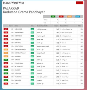 പാലക്കാട്: കൊടുമ്പ് പഞ്ചായത്തിൽ ഭരണം നിലനിർത്തി എൽഡിഎഫ്. 17 ൽ 10 സീറ്റുകൾ നേടിയാണ് എൽഡിഎഫ് ഭരണം നിലനിർത്തിയത്. 1, 2, 3, 4, 5, 6, 11, 12, 15,17 വാർഡുകളിൽ എൽ ഡി എഫും 10,13, 14, 16 വാർഡുകളിൽ യു ഡി എഫും 7,8,9 വാർഡുകളിൽ എന്ഡിഎയും വിജയിച്ചു. ആദ്യമായാണ് പഞ്ചായത്തിൽ ബി ജെ പി അക്കൗണ്ട് തുറക്കുന്നത്.