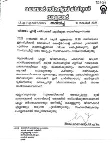 എല്ലാ ജീവനക്കാരും ജാഗ്രത പാലിക്കണമെന്നും രാത്രി സമയങ്ങളില് ഒറ്റയ്ക്ക് വിജനമായ പ്രദേശങ്ങളില് സഞ്ചരിക്കുന്നത് ഒഴിവാക്കണമെന്നും മലബാര് സിമന്റ്സ് തൊഴിലാളികള്ക്ക് പുറപ്പെടുവിച്ച മുന്നറിയിപ്പില് പറയുന്നു. സംശയാസ്പദമായ എന്തെങ്കിലും ശ്രദ്ധയില് പെട്ടാല് സെക്യൂരിറ്റി വിഭാഗം ഉള്പ്പെടെയുള്ള പ്ലാന്റിലെ അധികൃതരെ അറിയിക്കണമെന്നും നോട്ടീസിലുണ്ട്.