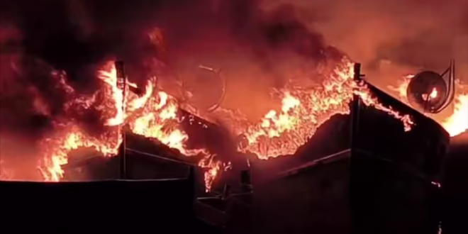 കൊല്ലം: കൊല്ലം കുരീപ്പുഴയില് കായലില് കെട്ടിയിട്ടിരുന്ന ബോട്ടുകളില് വന് അഗ്നിബാധ. നിരവധി ബോട്ടുകള് കത്തി നശിച്ചു. കായലില് കെട്ടിയിട്ടിരുന്ന ബോട്ടുകള്ക്കാണ് തീപിടിച്ചത്. പുലര്ച്ചെ രണ്ടരയോടെ കുരീപ്പുഴ പള്ളിക്ക് സമീപം അയ്യന്കോവിന് ക്ഷേത്രത്തിന് അടുത്താണ് സംഭവം. അഗ്നിബാധയുടെ കാരണം വ്യക്തമല്ല. ഫയര് ഫോഴ്സിന്റെ നിരവധി യൂണിറ്റുകള് സ്ഥലത്തെത്തി തീയണയ്ക്കല് തുടരുകയാണ്. സമീപത്തുണ്ടായിരുന്ന മറ്റ് ബോട്ടുകള് മാറ്റിയിട്ടുണ്ട്. തീ പടര്ന്നതിന് പിന്നാലെ ബോട്ടുകളില് ഉണ്ടായിരുന്ന ഗ്യാസ് സിലിണ്ടറുകള് പൊട്ടിത്തെറിച്ചിരുന്നു. ഇത് തീപിടിത്തത്തിന്റെ വ്യാപ്തി വര്ധിപ്പിച്ചുവെന്നാണ് അഗ്നിരക്ഷാസേനാ ഉദ്യോഗസ്ഥര് പറയുന്നത്.