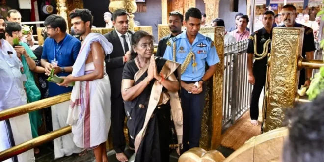 ദേവസ്വം മന്ത്രി വി.എന് വാസവന് ഉള്പ്പെടെയുള്ളവര് സന്നിധാനത്ത് രാഷ്ട്രപതിയെ അനുകമിച്ചിരുന്നു. രാവിലെ 7.30ഓടെ രാജ് ഭവനില് നിന്നാണ് രാഷ്ട്രപതി സന്നിധാനത്തേക്ക് തിരിച്ചത്. പമ്പയില് നിന്ന് പ്രത്യേക വാഹനത്തിലാണ് രാഷ്ട്രപതി സന്നിധാനത്തെത്തിയത്. തുടര്ന്ന് ഇരുമുടിക്കെട്ടുമായി 18ാംപടി ചവിട്ടുകയായിരുന്നു. രാഷ്ട്രപതിയോടൊപ്പം അംഗരക്ഷകരും ഇരുമുടി കെട്ടേന്തിയാണ് മല കയറിയത്. പൂര്ണകുംഭം നല്കിയാണ് തന്ത്രി രാഷ്ട്രപതിയെ സ്വീകരിച്ചത്.