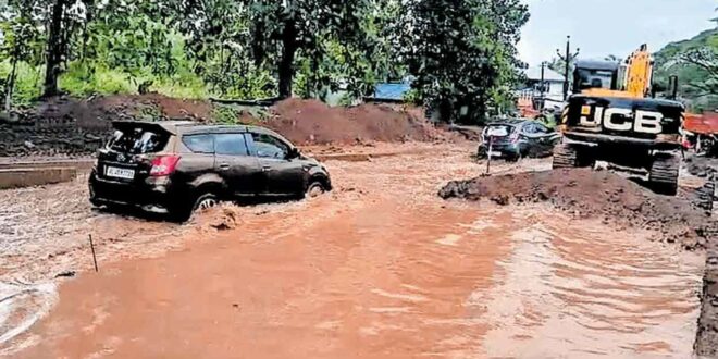 മലയോര ഹൈവേയുടെ നിര്മ്മാണ പ്രവൃത്തികളുടെ ഭാഗമായി റോഡിന്റെ ഇരുഭാഗങ്ങളിലും അഴുക്കുചാല് നിര്മിക്കുന്നുണ്ട്. ഇതിന്റെ ഭാഗമായി ഇരുവശങ്ങളിലും അഴുക്കുചാലിന്റെ ഭാഗം കോണ്ക്രീറ്റ് ചെയ്ത് ഉയര്ത്തിയിരിക്കയാണ്. ഇതിനിടയിലുള്ള ഭാഗത്താണ് വെള്ളക്കെട്ട്. റോഡ് പൊളിഞ്ഞു കിടക്കുന്ന ഭീമനാട് ക്ഷേത്രത്തിനും – ഭീമനാട് സെന്ററിനും ഇടയിലുള്ള ഭാഗത്താണ് വലിയ തോതില് വെള്ളം കെട്ടിനില്ക്കുന്നത്. ബസ്സടക്കമുള്ള വാഹനങ്ങള് പാറപ്പുറം വഴിയാണ് കടന്നുപോകുന്നത്. ഹിറ്റാച്ചി ഉള്പ്പെടെയുള്ളവ ഉപയോഗിച്ച് വെള്ളം ഒഴുക്കി താല്ക്കാലികമായി ഗതാഗതം പുന:സ്ഥാപിച്ചിട്ടുണ്ട്. മഴ തുടര്ന്നും പെയ്താല് വെള്ളക്കെട്ട് വീണ്ടും രൂപപ്പെടുമെന്ന ആശങ്കയിലാണ് നാട്ടുകാര്.